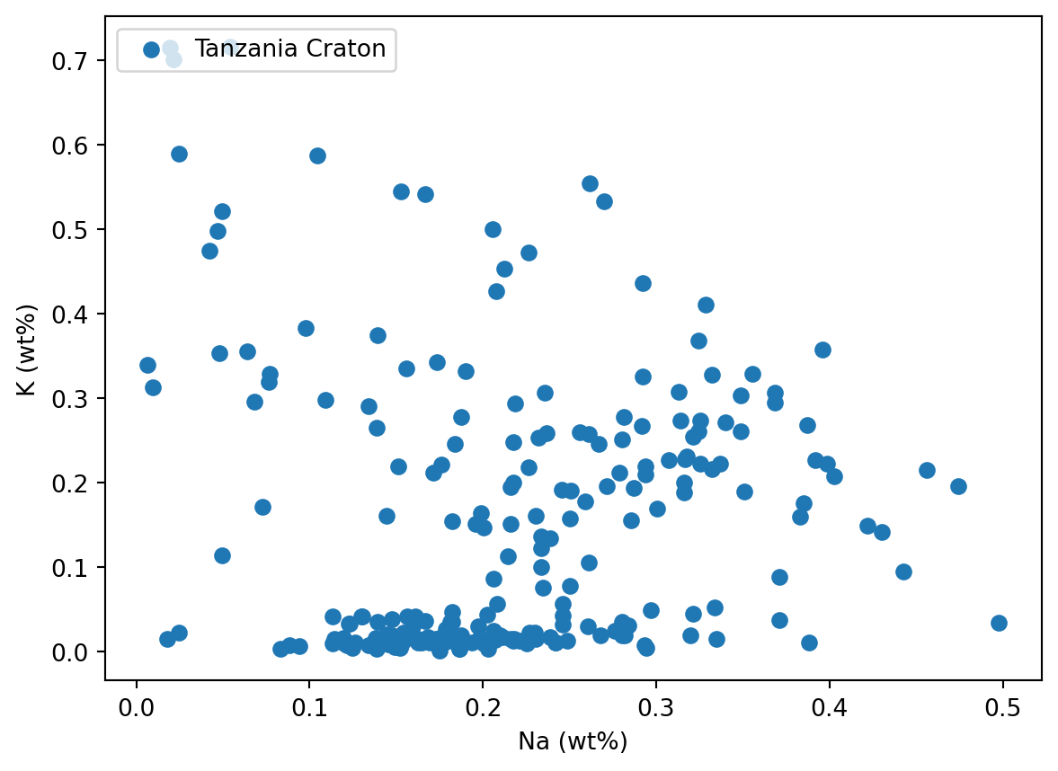interact(pltData, locality = localities, x_data = elements, y_data=widgets.Dropdown(options=elements, value='Mg'), x_ppm = False, y_ppm = False)<function __main__.pltData(locality, x_data, y_data, x_ppm, y_ppm)>