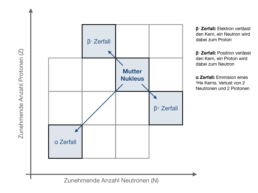 beta+ ein Positron wird verloren, und ein Proton wandelt sich in ein Neutron um, d.h. ein chemisches Element mit einer -1 geringeren Atom-Zahl wird gebildet
