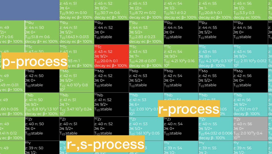 r-Prozess in einer Region mit relativ hoher Neutronen-Dichte statt. Existierende Neutronen werden in schneller Folge mit weiteren Neutronen beschossen, dabei bilden sich schwere Nuklide, die wieder in Richtung stabiler Nuklide mit höherer Massen-Zahl zerfallen können