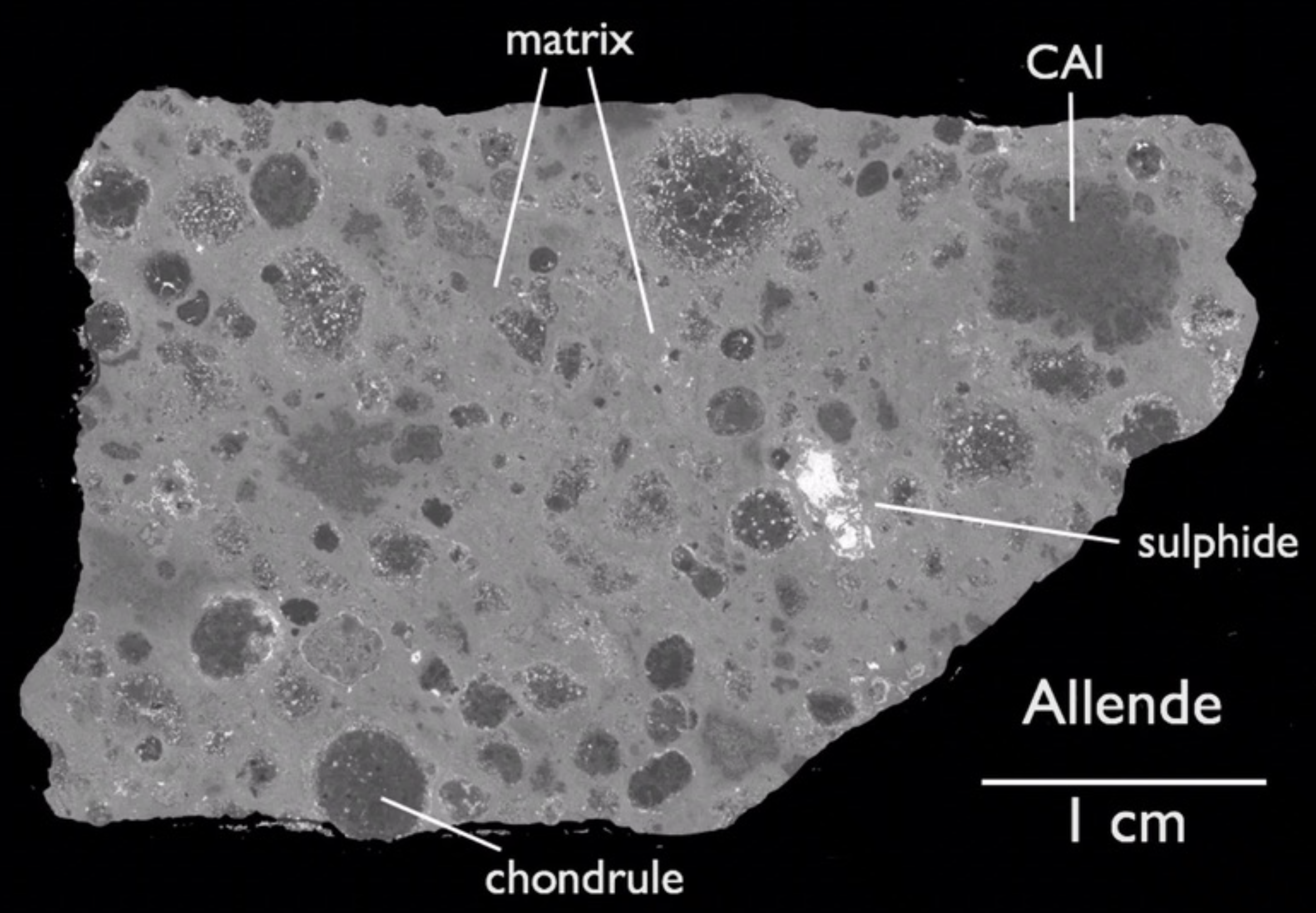 CAIs Unregelmäßig geformte Komponenten, ähnlich groß wie Chondren, bestehen hauptsächlich aus Ca & Al. Bis zu 3 vol