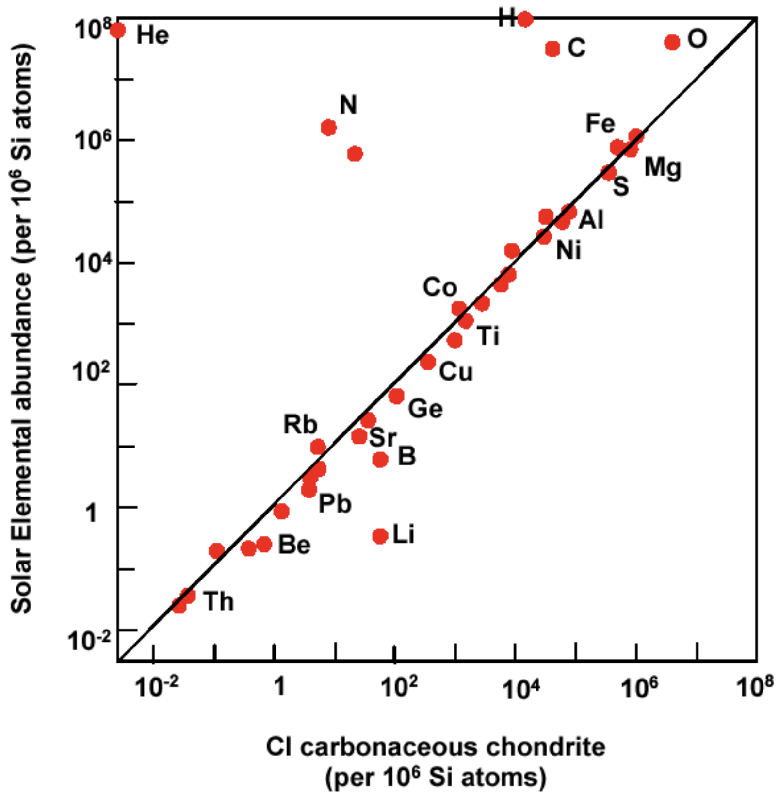 Ist das Diagramm nur für die Kosmochemie wichtig? (CI Chondrite haben die nahezu identische Zusammensetzung wie die Sonne. Da die Sonne mehr als 99.9% der Masse des Sonnensystems auf sich vereinigt, sollte die Zusammensetzung der Sonne repräsentativ für das Sonnensystem sein – und damit auch die CI Chondrite)