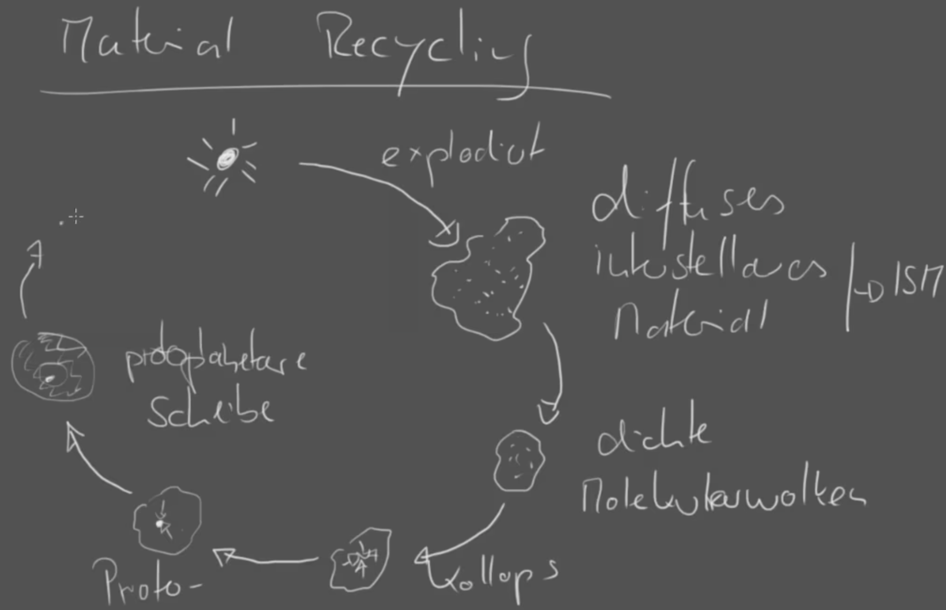 Beschreibe den Materiekreislauf in unserer Galaxie (Sterne explodieren → bilden diffuses, interstellares Material → daraus bilden sich dichte Materialwolken → diese kollabieren → weiter Verdichtung führt zur Fusion von Wasserstoff und der Bildung neuer Sterne → um einige können sich protoplanetare Scheiben bilden → in diesen wächst Material zu immer größeren Objekten, schließlich zu Planten → irgendwann explodiert der Stern → alles beginnt von vorn)