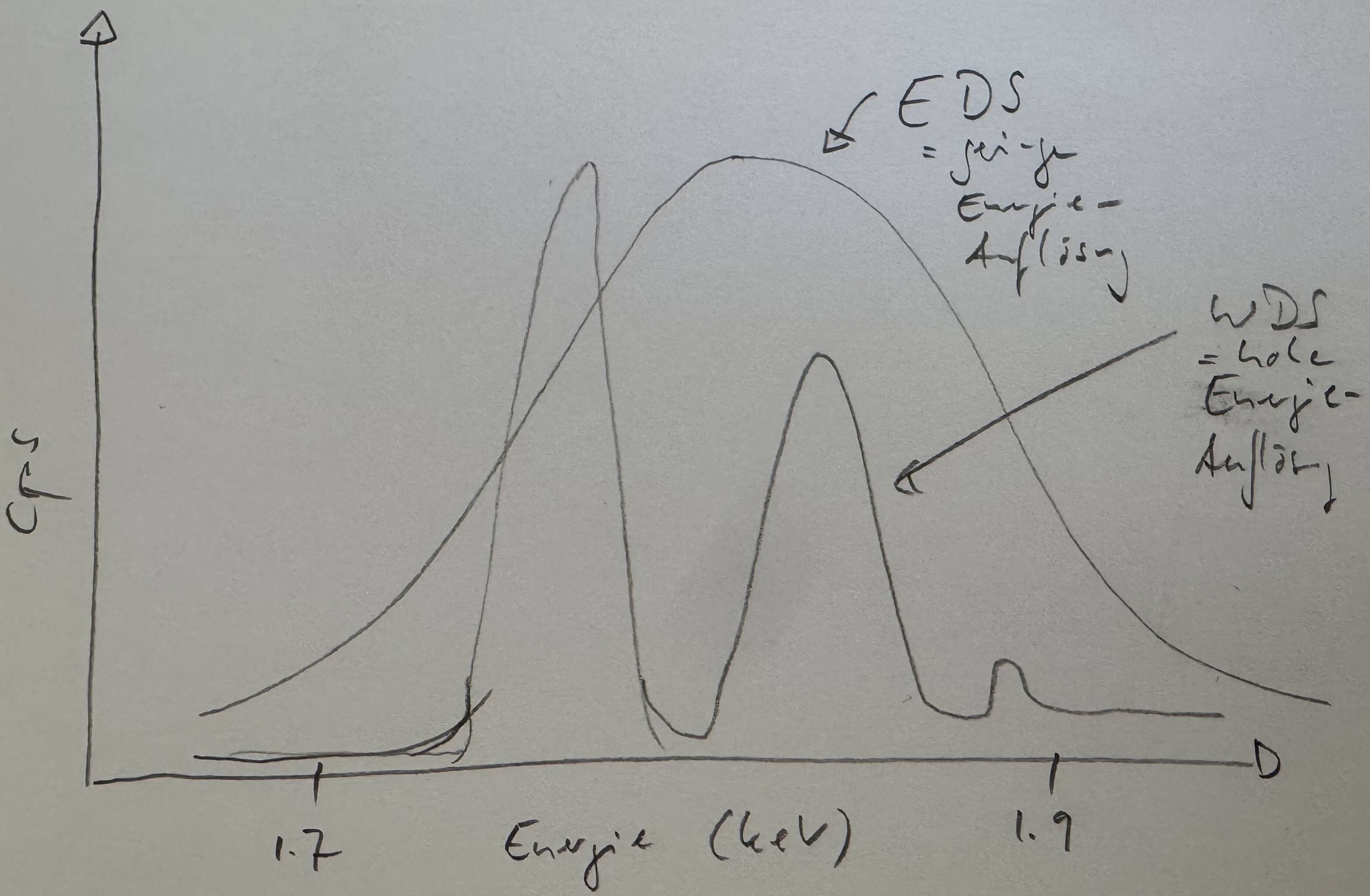 Bei WDS-Analysen wollen wir nur die Wellenlänge des Röntgenquants eines Elements messen. Diese können wir mit Hilfe von Analysator-Kristallen und der Bragg-Bedingung selektieren und in den Detektor lenken. Es müssen womöglich Röntgenlinien höherer Ordnung beachtet werden.